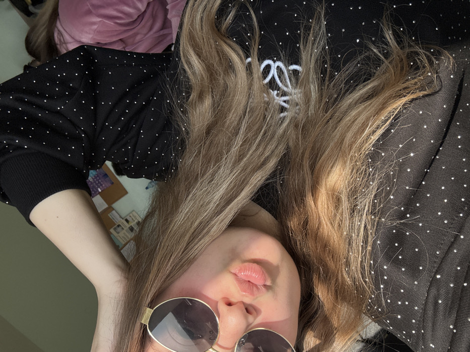 The image captures an indoor scene in Pleven, Bulgaria, featuring one prominent individual and partial visibility of another. The primary subject is a person with long, wavy blonde and light brown hair, angled slightly from above. The individual wears large, gold-framed sunglasses with dark lenses. The lips are puckered in a 'kiss' gesture. The person is dressed in a black long-sleeved top, uniformly adorned with numerous small, reflective silver studs. A white embroidered design is visible on the upper right chest area of the black top. The primary subject's left forearm and upper arm are visible, bent at the elbow. The background features a light green wall. A cork board with multiple papers or photographs pinned to it is visible on the wall. A clear plastic bottle is also present against the wall. Partially visible in the blurry background, to the right, is a second individual wearing a pink, possibly plush or velvet, hooded garment. Direct sunlight illuminates the primary subject, casting highlights on the face and hair.