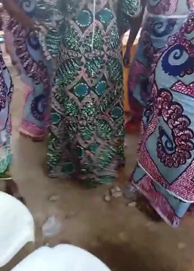 A group of women in vibrant African print dresses dance in a circle outdoors. The dresses are predominantly blue, pink, and green with bold patterns. White plastic chairs are visible in the foreground, and a few men can be seen in the background. The dance takes place under trees that provide shade, and the ground appears to be dirt or gravel.
