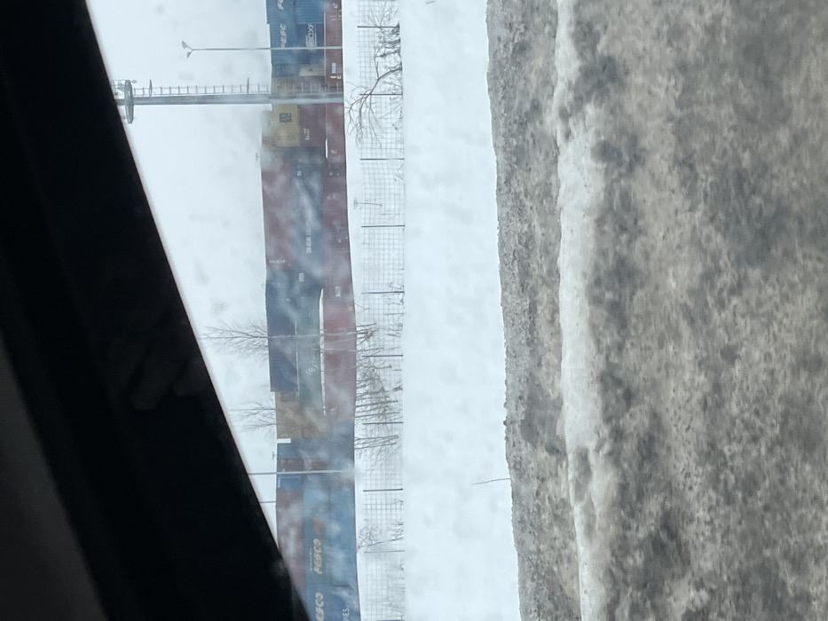 The image displays a winter industrial landscape in Zaramen'e, Russia, captured from a vehicle interior, with a dark interior trim element partially obscuring the upper left corner. The foreground features a snow-covered roadside verge, exhibiting distinct layers of grey-brown dirt and compacted snow. Beyond this, a expanse of cleaner white snow covers the ground, leading to a dark, wire mesh fence with vertical posts spanning horizontally across the midground. Several leafless deciduous trees and shrubs, some bent, protrude from the snow immediately behind the fence. The background reveals a container yard filled with numerous intermodal shipping containers, stacked two to three high, in various colors including blue, red, yellow, and green. Visible branding on some containers includes "PESCO" and "MSC." A tall, metallic industrial tower equipped with a ladder is present on the right side of the background, alongside a standard street light pole. The sky is uniformly overcast and light grey. No individuals or specific actions are discernible.