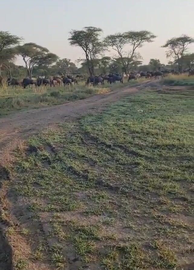 herd of wildebeest grazing in a grassy field. A dirt road cuts through the field. Trees with sparse foliage line the horizon. The sky is overcast.