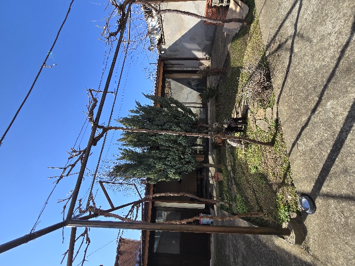 The scene depicts an outdoor courtyard in Pleven, Bulgaria, under a clear blue sky with strong sunlight casting distinct shadows. A metal trellis, supporting dormant grapevines, spans across the upper portion of the frame and extends into the foreground, with several upright posts anchored in the concrete. The ground comprises concrete paving in the immediate foreground and periphery, surrounding a central garden bed containing sparse green grass, several flat stone stepping stones, and patches of dry vegetation. Three evergreen coniferous trees are centrally positioned within the garden bed. In the background, two single-story structures are visible: a building on the left with dark-framed window or door panels, and a building on the right featuring a light-colored, textured wall. A small stack of terracotta roof tiles rests against the base of the right building. In the lower-left foreground, a dark-colored pet bowl rests on the concrete. Partially obscured by the central evergreen trees, two small, dark-furred canines are visible standing on or near the stepping stones within the garden bed.