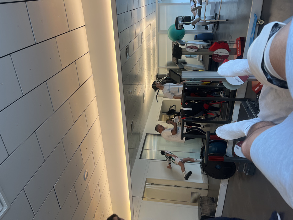 A mirror reflects a gym interior