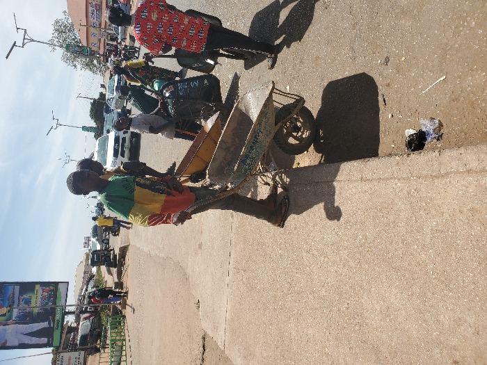 The image captures a sunlit street scene in Jos, Nigeria, depicting active urban transit. In the foreground, a young dark-skinned male, wearing a long-sleeved shirt patterned with green, yellow, and red stripes over dark trousers, pushes a single-wheeled, rusty metal wheelbarrow. A second, older wheelbarrow is stacked inside the first. To his right, partially obscured, is another young male. Further right, a person in a red patterned shirt pushes a dark-colored, three-wheeled cargo tricycle. The ground transitions from a light-colored concrete sidewalk on the left to an asphalt road on the right. Small pieces of debris are visible along the edge of the asphalt. On the road, several individuals walk, and multiple vehicles, including a white Toyota pickup truck and a silver sedan, are present. In the mid-ground, another person in a dark green top appears to be pushing a cart. On the left, a large billboard displays advertisements, including a figure in white clothing, colorful graphics, and text such as "Keep Moving." Below the billboard, green metal barriers separate the sidewalk from an unpaved area. Numerous streetlights equipped with solar panels are mounted on poles along the road. Commercial buildings and sparse trees line the street in the background under a clear, bright sky.