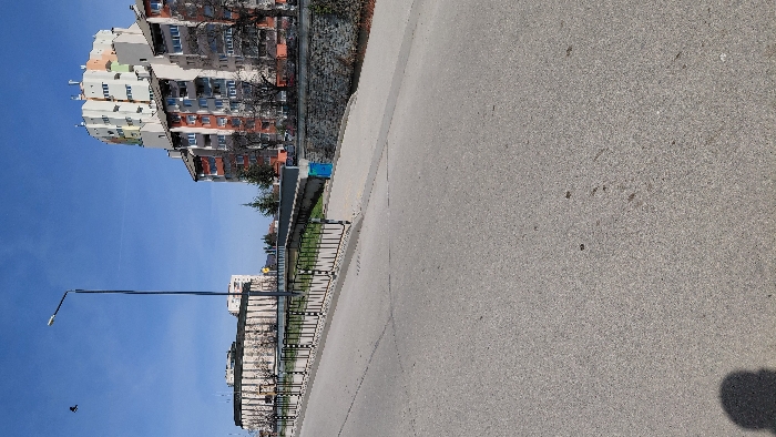 This image depicts a daytime urban scene in Gabrovo, Bulgaria, characterized by architectural structures and a clear blue sky. In the foreground, a gray asphalt road surface occupies the lower half of the frame, showing minor discoloration and debris. A partial human shadow, encompassing a head and shoulder, is cast onto the asphalt in the bottom-left corner. The midground features a black and white segmented metal railing running parallel to the road on the left, acting as a barrier. To the right of this railing, a concrete pedestrian path or ramp descends towards a lower level, alongside a stacked stone retaining wall. A blue waste receptacle is positioned on this pedestrian path. A body of water, likely the Yantra River, is partially visible beyond the stone wall to the right. Several deciduous trees with bare branches are scattered throughout the midground, some alongside the riverbank. In the background, on the left, stands the House of Humor and Satire, a large, multi-story brutalist-style building with a light gray, vertically textured facade and a dark roofline. Centrally, a tall, dark gray street lamp with a single light fixture extends upwards. To the right, a prominent multi-story residential building displays a facade with varying shades of brown and gray. Above this, a taller section of the building features light-colored balconies and colorful, abstract geometric patterns (green, orange, blue, yellow) on its upper levels. The sky is a clear, bright blue with no significant cloud cover. A single dark bird is captured in flight in the upper-left quadrant of the sky. No human figures are discernible in the scene. The overall location is in Gabrovo, Bulgaria, near the House of Humor and Satire, adjacent to the Yantra River.
