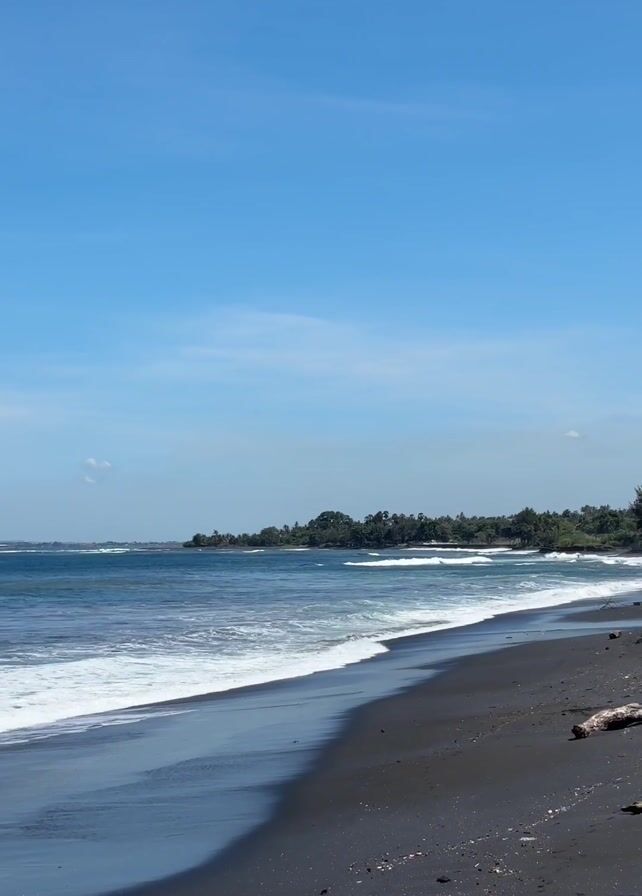 beach with black sand under a clear blue sky. Gentle waves roll onto the shore, leaving a wet sheen on the sand. The shoreline curves to the right, where vegetation can be seen. A few pieces of driftwood are scattered along the beach. A concrete structure is visible in the lower right corner.