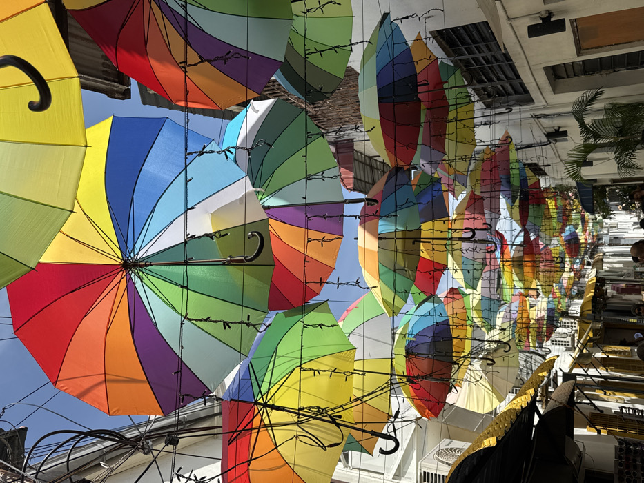 - "A vibrant array of rainbow umbrellas fills the sky above a street, strung together with string lights" by FM-iHKVg2, licensed under CC BY 4.0