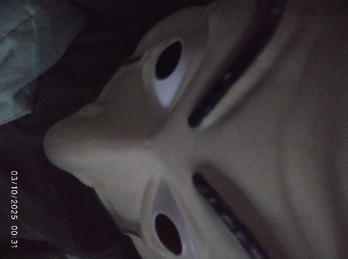 A light beige, stylized mask is depicted in a close-up, front-facing view, angled slightly downward, illuminated under low light conditions. The mask features a prominent, pointed nose, distinct circular black eyeholes with white sclera-like areas, and thick, dark, upward-curving eyebrows. The immediate background is dark and largely indistinct, with evidence of greenish-grey textured fabric visible in the lower foreground. No human subjects or discernible actions are present. A digital timestamp, "03/10/2025 00:31", is embedded in the lower right corner of the image. The scene is located in Rukn ad-Din Municipality, Syria.