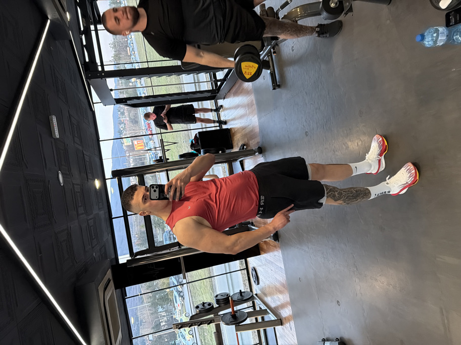 The image depicts an interior view of a modern fitness gym located in an urban area of Sofia, Bulgaria. Through large, floor-to-ceiling windows, an exterior scene is visible, featuring a multi-lane road with vehicle traffic, parked cars, and a prominent yellow McDonald's sign. Beyond the urban development, a range of hills or mountains is discernible under an overcast sky. Three adult males are present within the gym. In the foreground, positioned slightly left of center, a muscular male with a short, faded haircut wears a red sleeveless top, black athletic shorts with a white underlayer, white Nike socks, and white athletic shoes with red and orange accents. He is holding a black smartphone in his right hand, angled to capture a mirror selfie, which partially obscures his face. His right arm is visibly flexed, and his left hand is pointing downwards towards his left leg, which displays extensive dark tattoos from the calf to the ankle. To the right, in the midground, a second muscular male with short hair and a beard, wearing a black t-shirt and black shorts, is holding a 35 kg dumbbell (marked with a yellow "35" label) in his right hand. He has white wireless earbuds in both ears and appears to have tattoos on his left leg. He stands near a piece of gym equipment. In the background, positioned between the two foreground figures, a third male in a black t-shirt and black shorts stands facing the windows, engrossed in a smartphone he holds with both hands. The gym interior features a dark grey rubber mat flooring, a black textured ceiling with integrated linear LED light fixtures, and a ceiling-mounted air conditioning unit. Various gym equipment, including weight racks and machines, are visible throughout the space. A blue plastic water bottle rests on the floor in the bottom right corner.