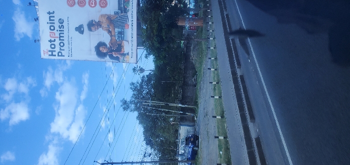 A roadside scene features a large billboard advertising "Hotpoint Promise," showcasing a couple. Fluffy white clouds dot a bright blue sky behind the billboard. Below, trees and vegetation line the road. The pavement is bordered by black and white striped posts. The edge of a highway is visible on the right.