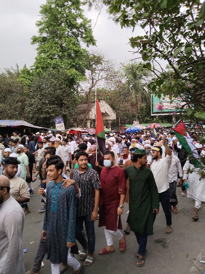 A large crowd of men, mostly wearing traditional clothing, are walking down a street in Dhaka, Bangladesh