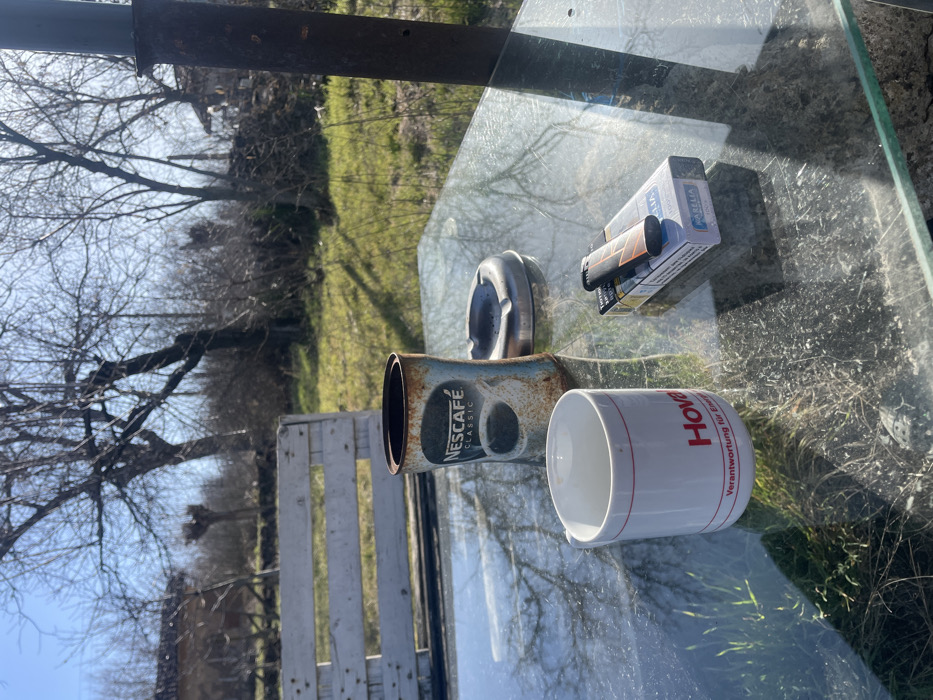 An outdoor scene in Topchii, Bulgaria, captures a glass-topped table under direct sunlight. On the table, from left to right, are a white ceramic mug with "Hoval Verantwortung für Energie" printed in red, a rusty metal Nescafe Classic can, a silver-colored metal ashtray, a pack of Karelia 100s cigarettes, and a black and orange lighter resting atop the cigarette pack. The table surface is dusty. In the background, a grassy area with patches of dry vegetation is visible. Several bare deciduous trees, indicative of late winter or early spring, dominate the midground. To the left, a white wooden bench or pallet structure is present. A rusty metal pole is partially visible on the far right. The sky is clear blue. No individuals are present.