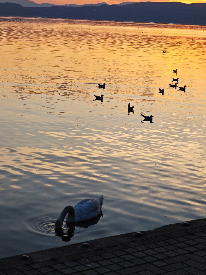 The image depicts a tranquil scene on Lake Ohrid in Ohrid, North Macedonia, at either sunrise or sunset. The foreground features a dark, patterned concrete or tiled waterfront edge along the bottom right, with several dark, circular studs or bollards embedded along its perimeter. A single, light-feathered swan is partially submerged in the water near this edge in the bottom left, its head and neck dipped below the surface, creating visible concentric ripples. The water surface, extending across the majority of the frame, reflects warm, golden-orange and light blue hues from the sky, with gentle ripples. Numerous dark-silhouetted seabirds, identified as gulls, are scattered across the water, floating calmly. Approximately 15 to 20 gulls are visible. In the background, a distinct horizon line separates the reflective water from a sky ablaze with orange and yellow, transitioning to soft purple and gray at the top. Dark, undulating mountain ranges are silhouetted against the bright sky, and a few small, dark specks, indicative of distant flying birds, are visible in the upper sky. No human figures are present.