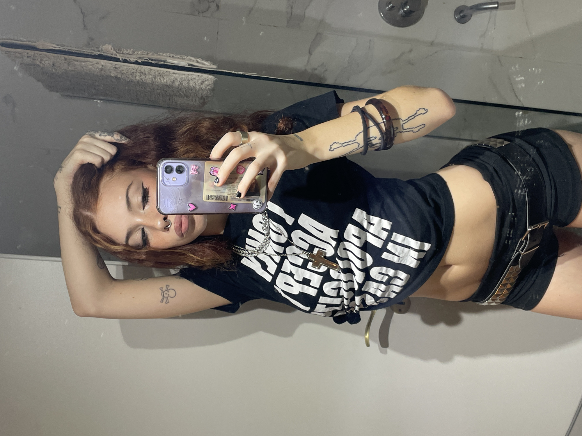 A young woman stands in a bathroom, facing a mirror and holding a smartphone to take a selfie. She has light brown hair with blonde highlights. Her tattoos include a skull and crossbones on her left arm and a stick figure design on her right arm. She wears a black T-shirt, black shorts, and a studded belt. A silver chain with a gold cross hangs around her neck. The bathroom has white marble walls and stainless steel fixtures. A glass shelf with a cleaning tool sits above the mirror. The location is likely a private residence. The city of Buenos Aires, Argentina, cannot be confirmed from this image.