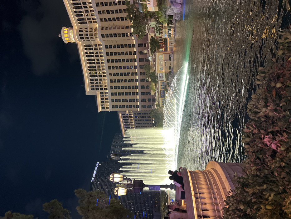 The image displays a nocturnal scene featuring the Fountains of Bellagio in Paradise, Nevada, United States