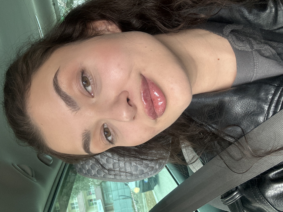 The image displays a young adult female occupying the front passenger seat of a vehicle in Budva, Montenegro. She is secured by a light grey three-point seatbelt diagonally across her chest and shoulder. The subject has medium-brown, wavy hair, brown eyes, and full lips coated with a high-gloss, light pink or mauve cosmetic. She exhibits a slight, closed-mouth smile while looking directly at the camera. Her attire includes a black faux leather jacket layered over a grey top. To her left, a grey, textured headrest is visible. Beyond the vehicle's window, an urban street scene is present, featuring a multi-story building with a light-colored facade and balconies. A dark-colored vehicle, partially obscured by the headrest, is visible on a paved street, displaying a yellow-bordered license plate. A light green barrier or fence lines the street, with sparse vegetation discernible further in the background. The scene is illuminated by natural daylight.
