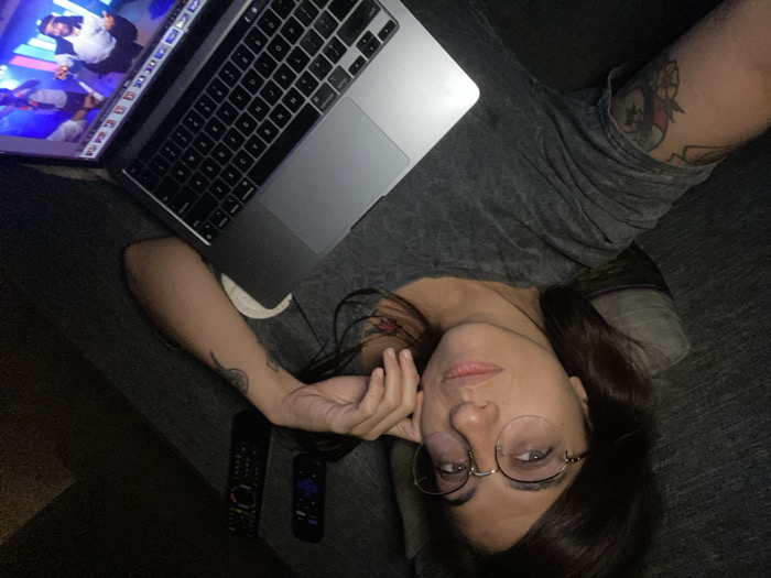 A person is lying on a gray couch with a laptop resting on their stomach. The laptop screen displays people on stage. The person has dark hair and is wearing glasses. Their left hand is near their face. Two black remote controls are on the couch near their left arm. Visible tattoos are on their left arm and right thigh. The person is wearing a gray shirt.