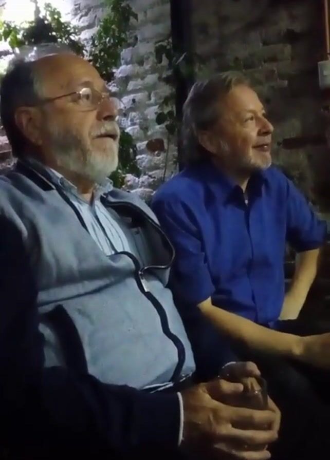 Two men are seated outside, potentially at a cafe or restaurant, on a dimly lit patio. The man on the left is wearing glasses, a gray vest over a dark shirt, and holding a drink in his hands. The man on the right has a blue shirt, and his arms are resting on his knees. A stone wall is visible in the background with some greenery. The men are looking to the side, potentially at someone off-screen, and appear to be engaged in a conversation.
