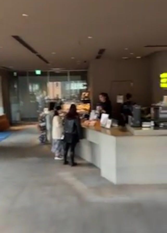 The video pans from a hallway into a modern coffee shop. In the hallway, there is a Christmas tree, a plant, and a stand with merchandise. The coffee shop has a long, light gray counter with coffee-making equipment and a display of liquor bottles. There are a number of employees behind the counter. The seating area has brown ottomans and small tables, and many people are sitting and standing around, talking and drinking coffee. The walls are a light gray-brown color. The floor is gray and polished.
