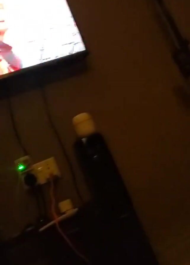 A television screen is displaying a movie scene. The movie scene appears to be a medieval setting with people dressed in armor and red capes. The room is dimly lit, and there are various items beneath the television including an outlet, a light fixture, and a speaker. The camera pans around the room.
