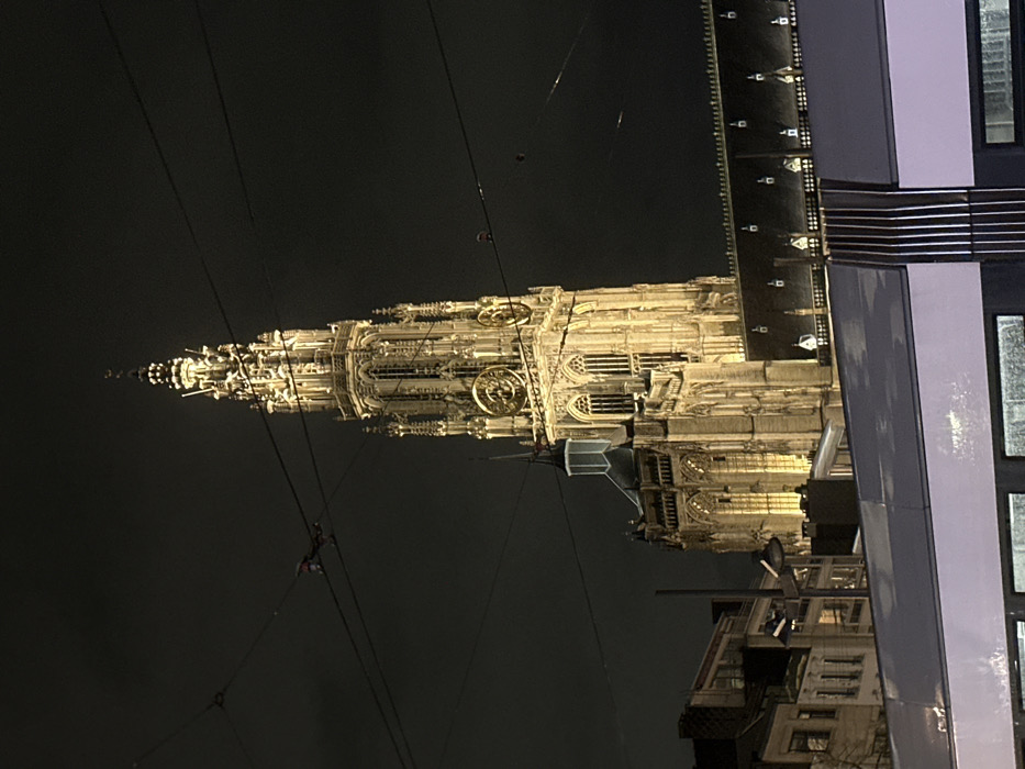 - "An upward-angled, low-light photograph captures the illuminated spires and upper sections of the Cathedral of Our Lady in Antwerp, Belgium, against a dark, overcast night sky" by FM-MHDnZ2, licensed under CC BY 4.0