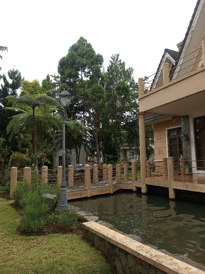 A tranquil waterscape features a narrow canal alongside a house with an overhanging balcony and visible windows. A decorative fence with posts lines the water's edge, and a vintage lamppost stands near the canal's bank amidst greenery. Lush trees and foliage populate the background, suggesting a serene, natural setting. A stone wall borders the canal on the lower right, separating the lawn from the water. The overall scene evokes a sense of peaceful coexistence between architecture and nature.