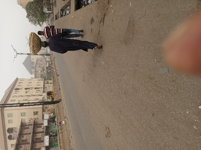 A street scene showcases two pedestrians walking on the road's left side. The first individual, dressed in a dark robe, carries a large, woven basket on their head. A second person follows, wearing a striped shirt and blue jeans. The backdrop features buildings, a street lamp, and visible waste along the sidewalk. The overall atmosphere is hazy, potentially due to pollution or fog. A part of the camera operator's hand is in the picture.