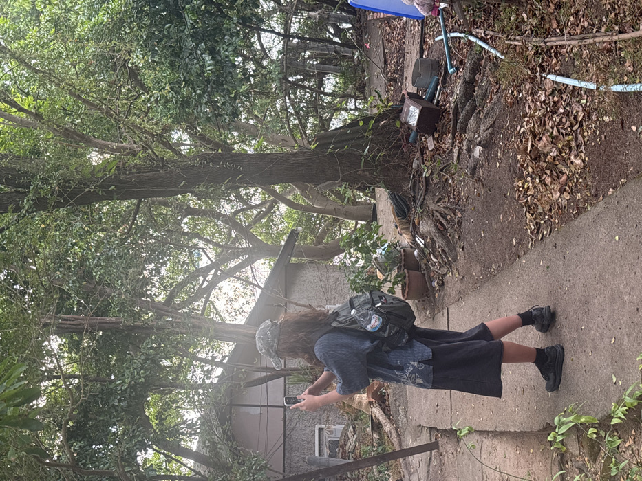 An individual stands on a concrete path in Koh Tao, Thailand, facing away from the viewer and slightly to the left. The person wears a camouflage-patterned cap, a dark blue short-sleeved shirt with light designs, dark knee-length shorts, and black athletic shoes, and carries a dark green backpack with an attached water bottle. They are holding a light-colored smartphone horizontally with both hands, aiming it forward as if taking a photograph or video. To the left and slightly behind the person, a light-colored, single-story building with a dark roofline is partially visible amidst dense green foliage. The path is flanked by abundant vegetation, including numerous trees with exposed roots. The ground to the right of the path is reddish-brown soil covered with fallen leaves and scattered debris, including terracotta pots with plants, segments of light blue PVC pipe, and an overturned wooden frame. The overall environment is heavily treed, suggesting a natural or semi-developed area within the city.