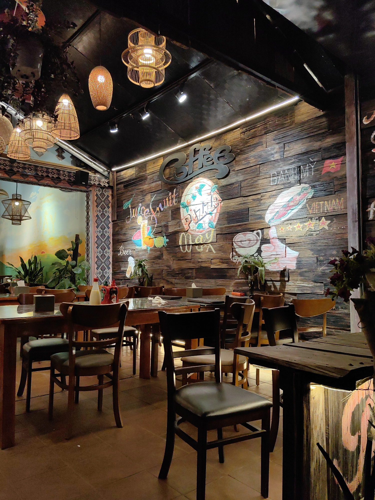 The image displays the interior of an unoccupied cafe or restaurant located in Sa Pa, Vietnam. The scene is illuminated by warm, ambient light originating from various fixtures. A prominent wall on the right is constructed from dark, horizontally-oriented wooden planks, featuring chalk-style illustrations and text. Visible text includes "Coffee," "Juice Fruit," "Beer," "Banh Mi," "Vietnam," and a five-star rating. Illustrations consist of a pizza slice, a cocktail glass, a coffee cup with a thumbs-up, a banh mi sandwich, and a Vietnamese flag. A linear LED strip light runs along the top of this wooden wall. Opposite, a wall or partition exhibits a vibrant mural depicting a landscape with greenery and a sunset or sunrise, bordered by a textile fabric with intricate geometric patterns. The dark ceiling supports multiple woven bamboo and rattan pendant lights, along with recessed spotlights. Green foliage is visible both hanging from the ceiling and in potted plants on surfaces. The floor is tiled with light brown squares. Numerous wooden tables with dark, reflective surfaces are arranged throughout the space, each accompanied by multiple dark-seated wooden chairs. On one central table, a tissue box, a red sauce bottle, and a white sauce bottle are present. To the right, a rustic wooden counter or bar section, also featuring chalk-style art and under-lighting, holds a vase containing dark purple flowers. No individuals are visible, and no actions or interactions are depicted.