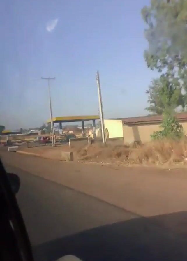 view from inside a moving car driving down a paved road on a clear, sunny day. The road is dry and dusty, and the landscape appears to be rural, with dry vegetation and sandy areas alongside the road. In the distance, there are buildings and telephone poles visible. A gas station can be seen on the side of the road. As the car passes the gas station, people and vehicles are visible, including a motorcyclist. The camera appears to be mounted inside the car, capturing the perspective of someone in the driver's seat or passenger seat. The general impression is that the video was taken in a developing area, likely in a hot and dry climate.