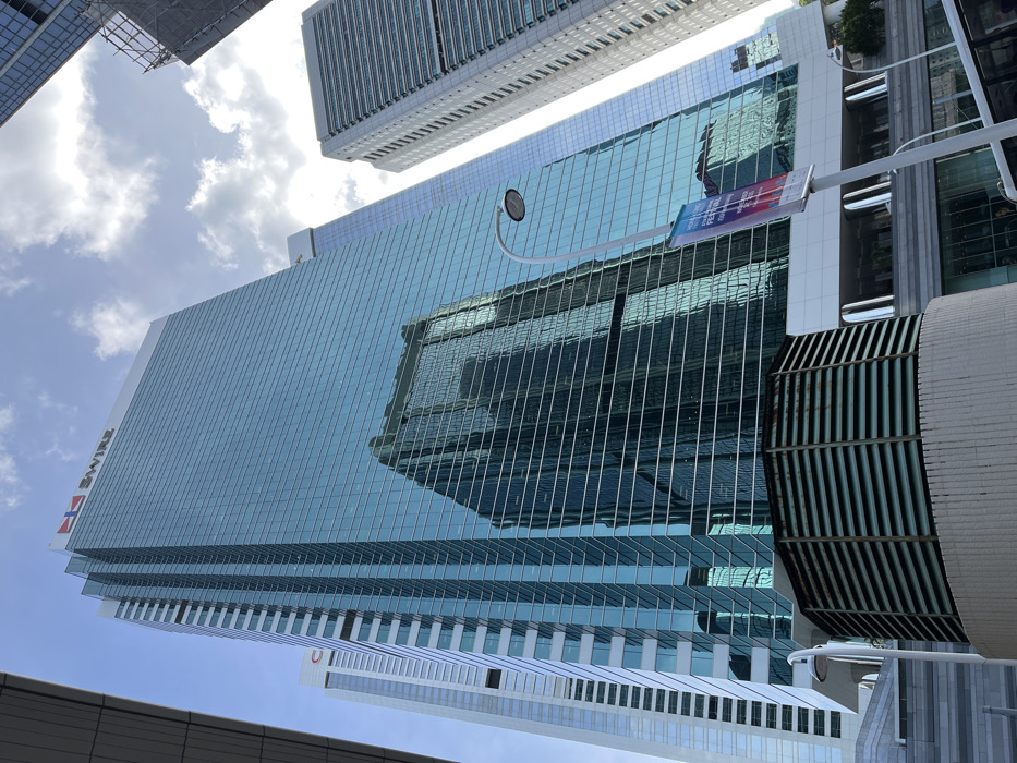 - "A tall, modern skyscraper dominates the image, featuring a reflective blue-green glass curtain wall facade" by FM-Amqid2, licensed under CC BY 4.0