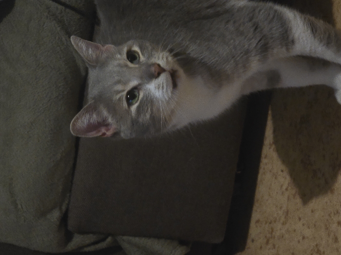 A gray cat with white markings lies on a brown cushioned surface. The cat is positioned in the top half of the frame, with its head near the left side. Its green eyes are open, and its ears are perked up. The background consists of a textured floor and part of what appears to be another cushion. The scene is softly lit.
