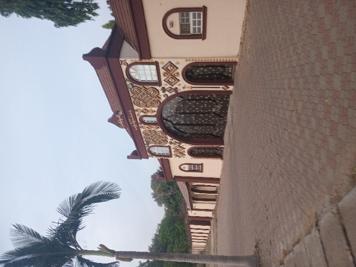 A building with beige walls, brown trim, and intricate geometric designs around its windows and arched doorway. The building has a brown roof and is situated next to a paved walkway. A tall palm tree stands in the foreground with lush green trees behind the building. The sky is overcast and grey.