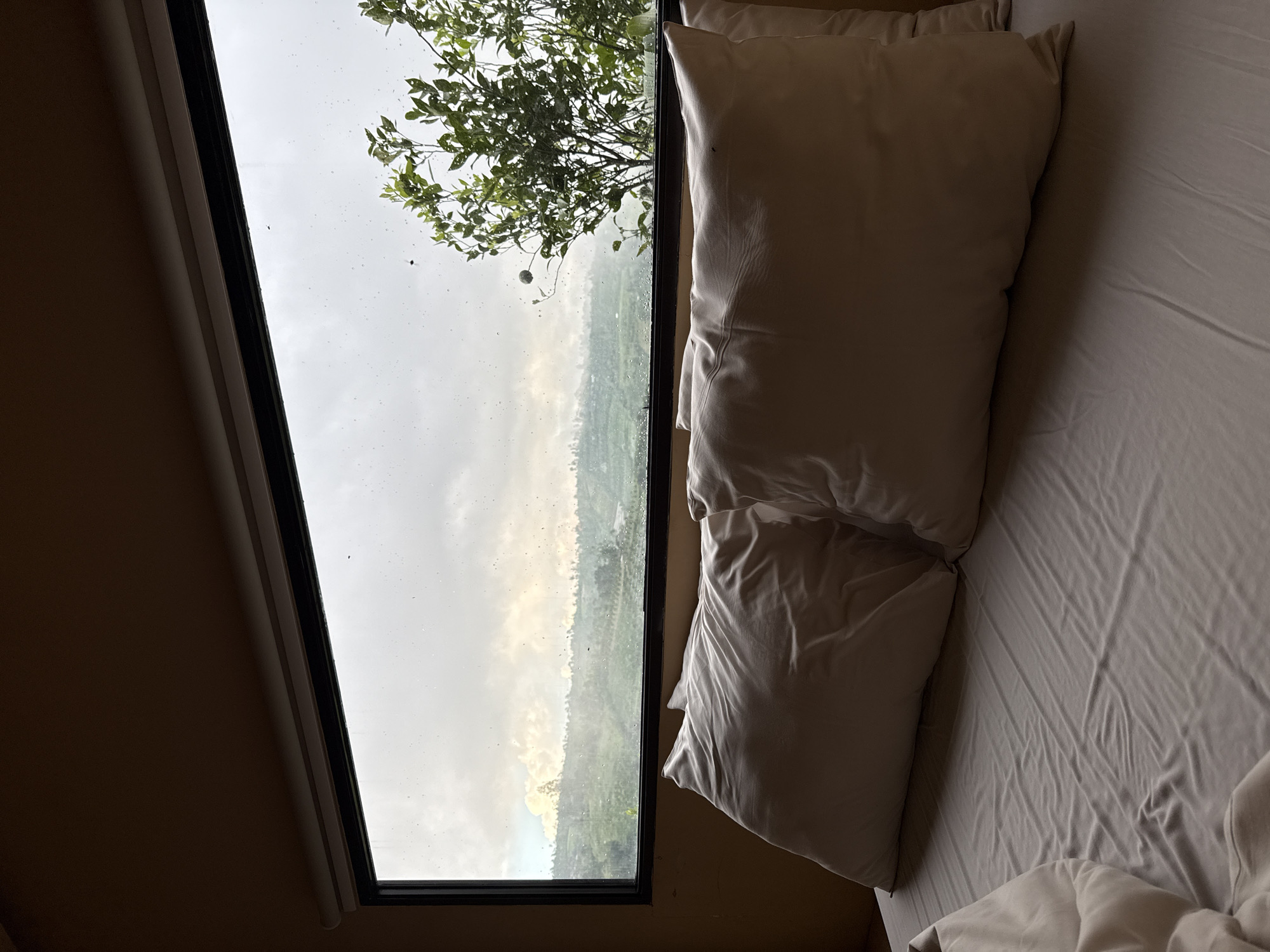 view from a bed in a room in Petang, Indonesia. Outside the window, a tree is visible along with a landscape of trees. It appears to be raining outside. Two pillows lie on the bed, which has white linens.