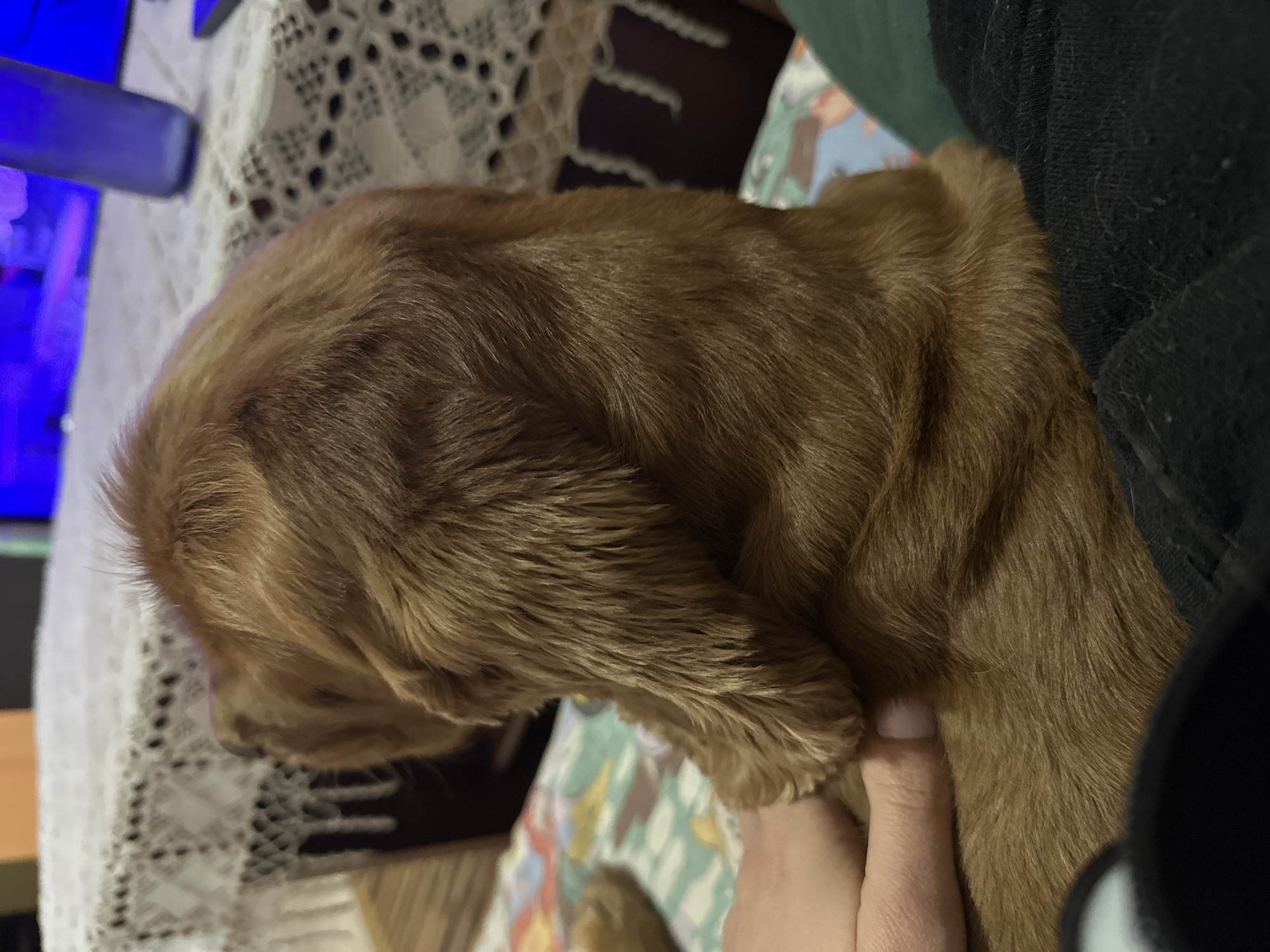 - "A close-up shot depicts a brown Cocker Spaniel puppy resting its head on a patterned surface next to a person's hand" by FM-6tCKA3, licensed under CC BY 4.0