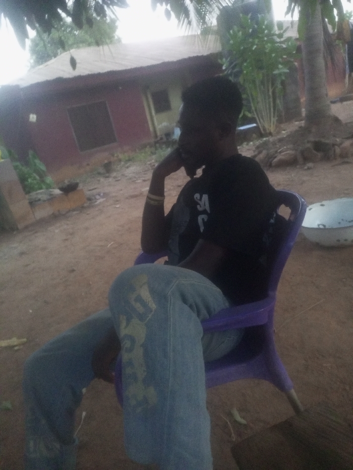 A man sits in a purple plastic chair outdoors. He wears a black t-shirt and patterned light blue jeans. He's holding a mobile phone to his ear, seemingly engaged in a conversation. The background features a red house with a silver roof, trees, and foliage. The ground is dirt. There's a metal bowl sitting on the ground near the chair.