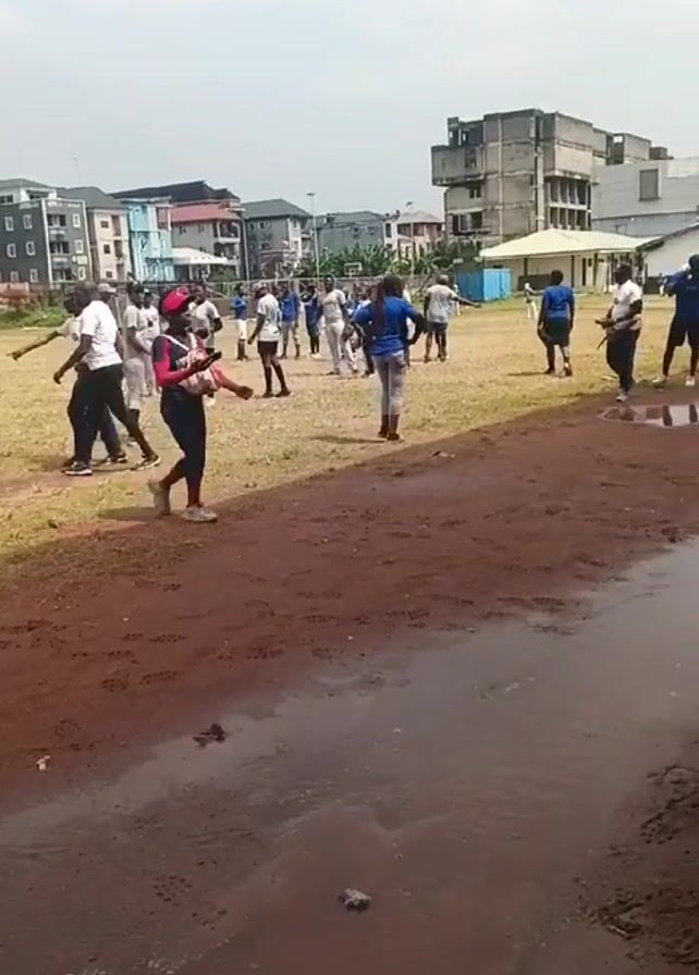 group of people on a grassy field. Many of them are wearing white or blue shirts and appear to be in a large group. Some people are walking around and conversing, while others are standing still. In the foreground, there is a muddy area with a large puddle reflecting the sky and the person standing in front of it. The person is wearing dark pants, a red shirt, and has the number 11 on the back. Buildings can be seen in the background, suggesting an urban or suburban setting.
