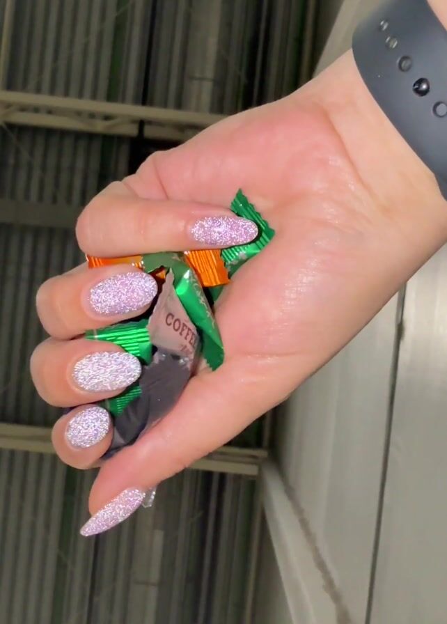 A hand with glittery, pointed nails holds a collection of individually wrapped candies. The candies vary in color, with some wrapped in green, orange, purple, and silver. A black smartwatch is visible on the wrist. The background features industrial-looking metallic ceiling structures, suggesting an indoor setting like a warehouse or factory. The hand subtly moves, causing the candies to shift slightly.