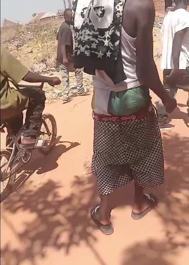 group of people on a dirt road in what appears to be a rural or underdeveloped area. The main subject is a young man with dreadlocks wearing a white tank top, checkered shorts, and sandals. He is also wearing a backpack. His pants are sagging low enough to expose his underwear. He turns around at one point during the video. Other people are walking nearby, and a child is riding a bicycle in the background. The setting includes modest buildings and a dusty landscape under a bright sky. The general atmosphere suggests a casual, everyday scene in a warm climate.
