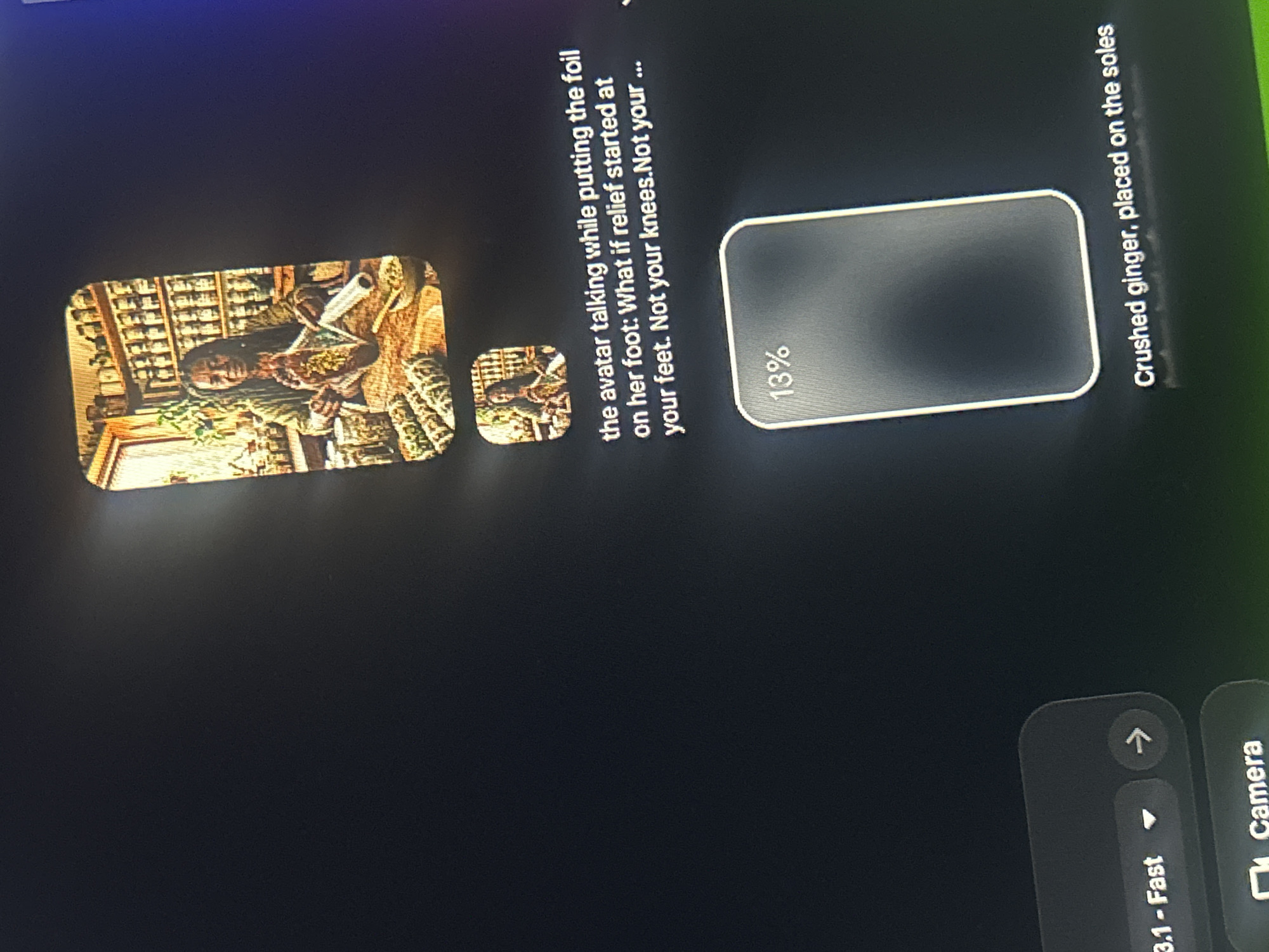 screen capture of a phone or tablet, displaying search results. The results include two small image thumbnails, followed by the text "the avatar talking while putting the foil on her foot: What if relief started at your feet. Not your knees. Not your ...". Below this, there's a grey box labeled "13%". To the right of the box, the text "Crushed ginger, placed on the soles" is visible. The device's camera controls are partially visible at the bottom right corner. There is no information to suggest that this image is in Voluyak, Bulgaria.