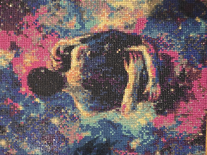 This image depicts a close-up view of a completed diamond painting, a mosaic art form created from small, faceted resin beads