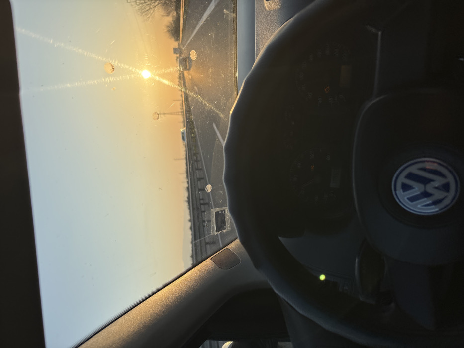 The image presents a forward-facing view from inside a Volkswagen vehicle, likely on a multi-lane highway near Shishmantsi, Bulgaria. The scene is captured during sunset or sunrise, with the sun low on the horizon, directly ahead and slightly to the right, emitting a strong glare that highlights dust and smudges on the windshield. Streaks of light emanate radially from the sun, which appears as a bright, circular, yellow-orange orb. The highway is visible with multiple lanes and a central crash barrier separating opposing directions of traffic. Several vehicles are present on the highway; one white car is distinct in the distance on the left lane, while others are less defined due to the backlight. The sky transitions from a pale blue at the top to a warm orange-yellow near the horizon. Distant, low-lying mountains or hills are faintly visible on the left horizon, and utility poles or transmission towers stand along the right side of the road. Inside the vehicle, the dark-colored steering wheel, bearing a silver Volkswagen logo in its center, occupies the lower portion of the frame. A segment of the A-pillar is visible on the left. The dashboard and instrument cluster are largely in shadow, making specific details unidentifiable, though some indistinct illuminated indicators are perceptible. The overall environment suggests active transit on a major road.