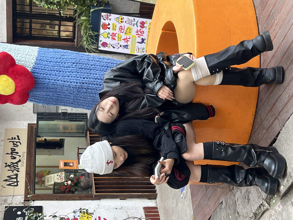Two young adult females are seated outdoors on a large, bright orange, ring-shaped sculptural bench in Yuzhong District, China. The female on the left wears a light grey beanie with a red 'TS' logo, a black long-sleeved top, a black jacket, a short black skirt, and black platform knee-high boots. She is actively viewing a white smartphone held in both hands. The female on the right, wearing a black faux-leather jacket, a short black skirt, nude tights, white leg warmers, and black platform knee-high boots, has her head resting on the left female's left shoulder, eyes closed, appearing to be asleep or resting. She holds a yellow-cased smartphone in her right hand, resting on her lap. Behind the individuals, to the left, is the entrance to 'Shan Cheng Coffee' (山城咖啡) with a wooden frame and items displayed inside, including artificial red flowers. To the right, a tall, thick column-like structure, predominantly blue and made of chunky knit yarn with a large red and yellow fabric flower atop, stands next to a white freestanding sign featuring colorful illustrations and Chinese text. The ground surface in the foreground consists of worn pavement.