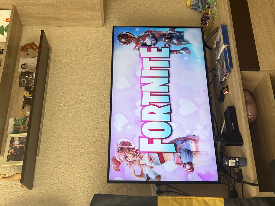 An indoor scene in Paspal, Bulgaria, displays a large, flat-screen television powered on and centered on a light wooden media console. The television screen shows the title screen for the video game "Fortnite," featuring a pink-haired female character in a white top and denim shorts making a heart gesture on the left, and a red and black armored character on the right, against a pink and blue background with numerous white hearts. Below the television, on the media console, a black Vivacom set-top box and a black roll-on deodorant bottle are positioned to the left. Various power and audio-visual cables are visible behind these devices. To the right of the television, three blue-spined PlayStation 4 game cases are stacked horizontally, one identified as "Far Cry." Further to the right, colorful wrappers, possibly from candies or snacks, are partially visible. A pink heart-shaped inflatable object is placed on a lower shelf of the media console. A section of a black and yellow flag hangs vertically to the far left, partially obscuring a double electrical outlet. Above the television, a single dark wooden floating shelf is mounted on a light beige textured wall. Arranged on the shelf from left to right are a light wooden animal figurine (possibly a giraffe), a framed photograph of multiple individuals, a smaller framed photograph of a child, a small decorative pumpkin-like object, a dark figurine, a brown decorative owl-patterned object, an unframed or thinly framed photograph of a child, and a wooden horse figurine. A small green artificial Christmas tree and a red decorative item are partially visible on the far right end of the shelf. No individuals are present in the image.
