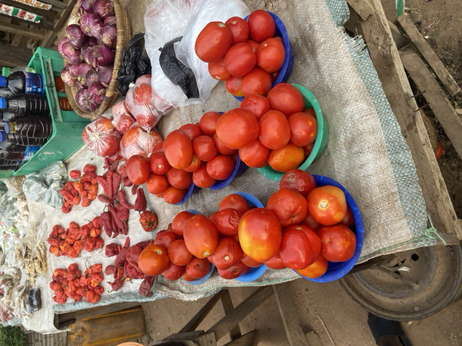 A market cart displays a variety of produce. Red tomatoes are piled in four colorful bowls. Red onions are in a woven basket. Clear plastic bags contain more red tomatoes. Bottles of dark liquid sit in a green plastic container. Heaps of red peppers of varying sizes are scattered on the cart. The cart is covered with a gray fabric. A metal wheel is visible on the side.