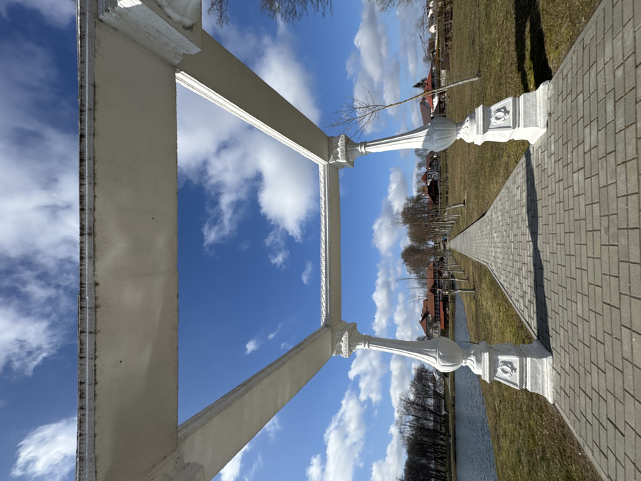 The image displays an outdoor scene in Падлабенскі сельскі Савет, Belarus, under a bright blue sky with scattered white cumulus clouds. A white, partially ornate architectural structure, likely a pergola, occupies the foreground, framing the view. This structure consists of two visible vertical supports, each featuring a decorative baluster resting on a substantial plinth, supporting horizontal beams overhead. Dark discoloration and weathering are apparent on the underside of the upper beams. A straight pathway made of grey rectangular pavers extends centrally from the foreground into the distance. To the left of the pathway is a calm body of water, possibly a lake or pond, with grassy banks. To the right of the pathway is a strip of sparse, dry-looking vegetation. The midground and background feature numerous deciduous trees, mostly bare, lining both sides of the pathway and the far side of the water. In the distant background, a cluster of buildings with reddish-brown roofs is visible, indicating a small settlement. No individuals or animals are present. The scene is brightly illuminated by direct sunlight, casting distinct shadows from the architectural structure and trees onto the pathway and ground.