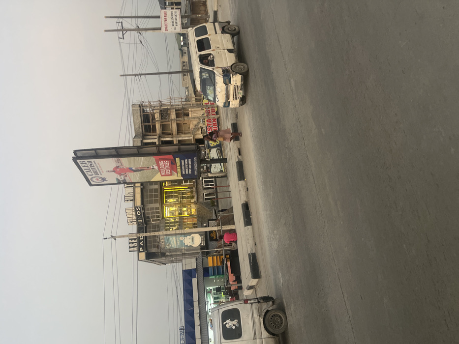 A street scene with buildings, vehicles, and pedestrians. An advertisement for Caleb British international school is prominently displayed. A white van is parked on the street, and another vehicle is visible further down. Buildings line the street with scaffolding on one construction. Power lines crisscross above the buildings. The sky is overcast and hazy.