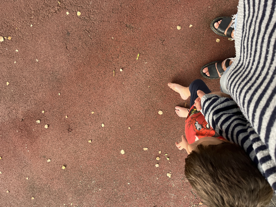 - "An overhead perspective captures an adult and a child on a red-brown, granulated rubberized surface consistent with a playground" by FM-CRvhO2, licensed under CC BY 4.0