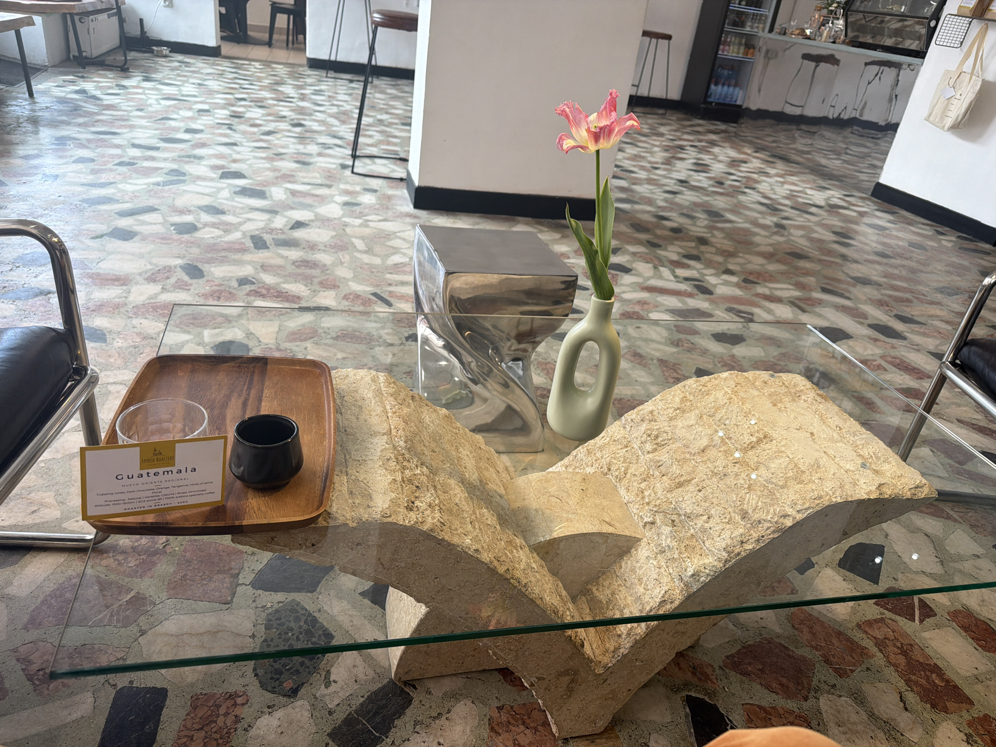 The image depicts a café setting in Brasov, Romania, featuring a low glass table with a unique base made of large, irregularly shaped stone pieces. On the table, there is a wooden tray containing a small glass, a black cup, and a card labeled "Guatemala" and "SPIRED ROASTERY," likely indicating the type and origin of coffee being served. Beside the tray, there's a vase with a single pink tulip. A reflective, distorted metal stool sits nearby. The table is flanked by chairs with metal frames and black leather seating. The floor is a patterned mosaic of various-colored stones. In the background, other tables and chairs are visible, along with a service counter. The scene appears to be indoors during the daytime.