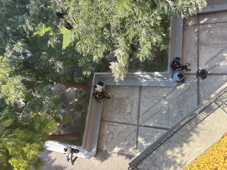 An aerial view captures a paved courtyard surrounded by trees. Several people are scattered around the courtyard. Two individuals sit side-by-side on a ledge beneath a tree. Another group of three people is gathered near a corner of the courtyard. One person stands while the other two sit on the ledge. A couple of people stands beneath a tree in the corner. The courtyard is divided into squares with dark lines, and shadows cast by the nearby trees. A glimpse of a yellow facade is visible in the lower right corner.