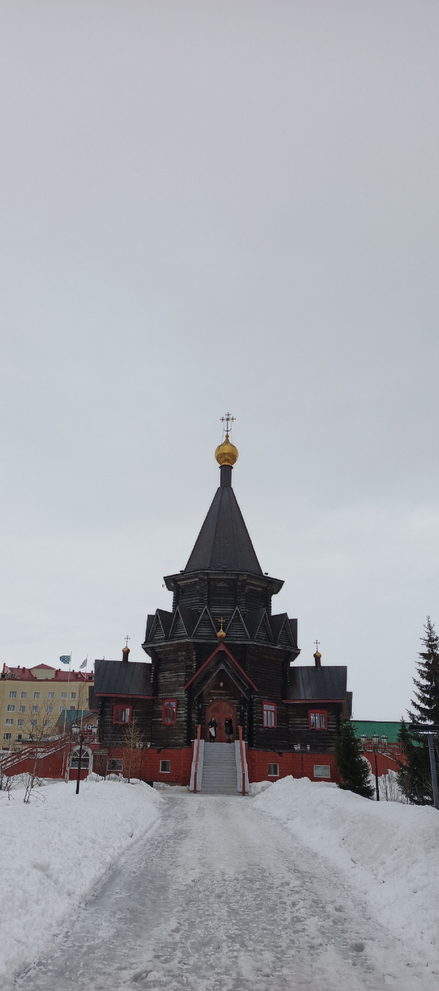 dark wooden Orthodox church in Nar'yan-Mar, Russia. The church has a distinctive pointed tower topped with a golden dome and a cross. The facade of the church is dark wood with red trim around the windows and base. A set of gray stairs leads up to the entrance. There are two people standing near the entrance of the church. The ground is covered in snow and ice, with a cleared path leading to the stairs. In the background, there are buildings of the city. The sky is overcast and gray. A few trees are visible on the right side of the image. Flags are seen near the church in the background.